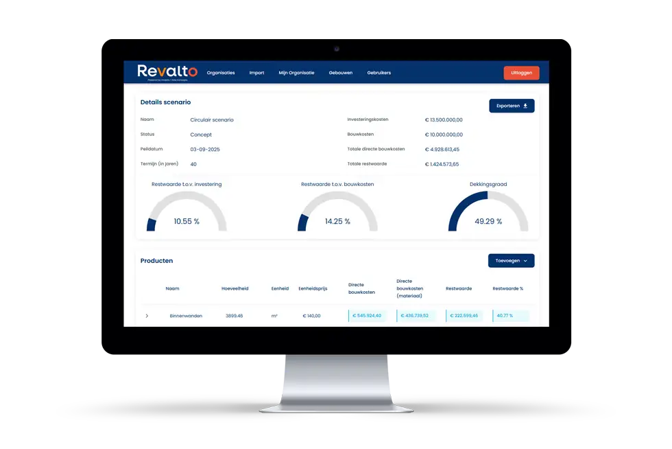 Revalto is een innovatieve softwaretool die op gebruiksvriendelijke wijze inzicht geeft in de financiële restwaarde van bouwproducten. Door betrouwbare data te combineren met een gevalideerde methodiek, maakt Revalto het mogelijk om deze restwaarde nauwkeurig en efficiënt te berekenen.